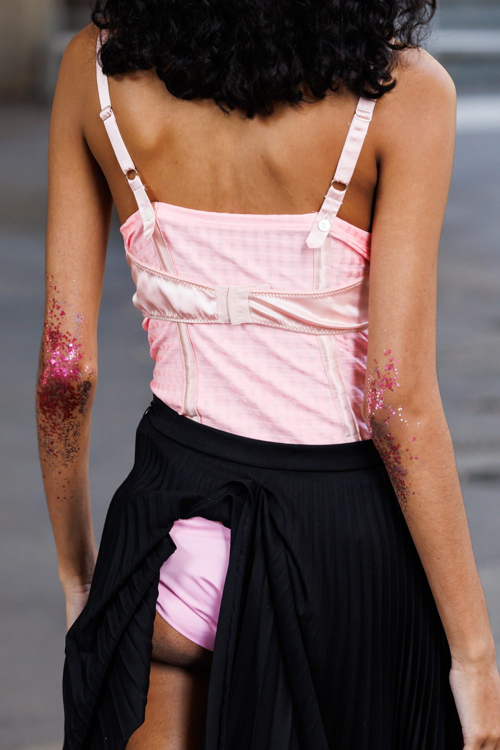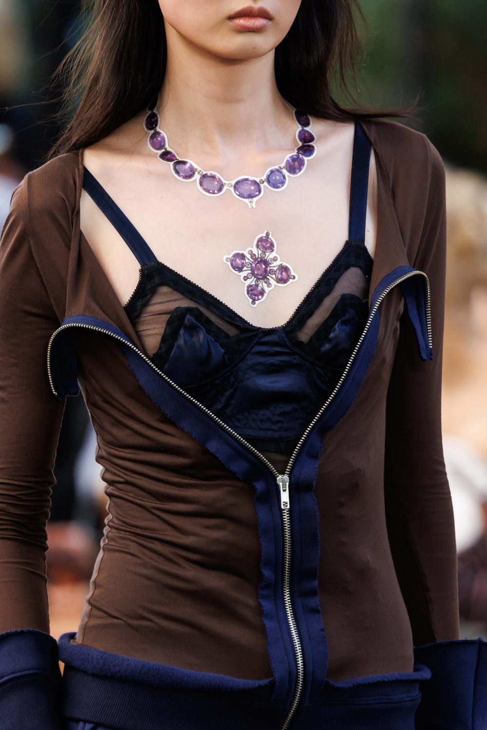Schellebelle/Paris, 29 September 2025 – For her fourth show in Paris, up-and-coming talent Julie Kegels approached Marie Jo. In search of craftsmanship, precision and lingerie expertise, she ended up in Marie Jo's studio. In collaboration with the design team and seamstresses, various lingerie-inspired show pieces were created. Craftsmanship and sustainability go hand in hand for both Marie Jo and Julie Kegels, giving deadstock a second life. Julie Kegels chose materials from Marie Jo Avero, the iconic lingerie set with a diamond pattern and daisy straps that will celebrate its 30th anniversary in the collection next year.